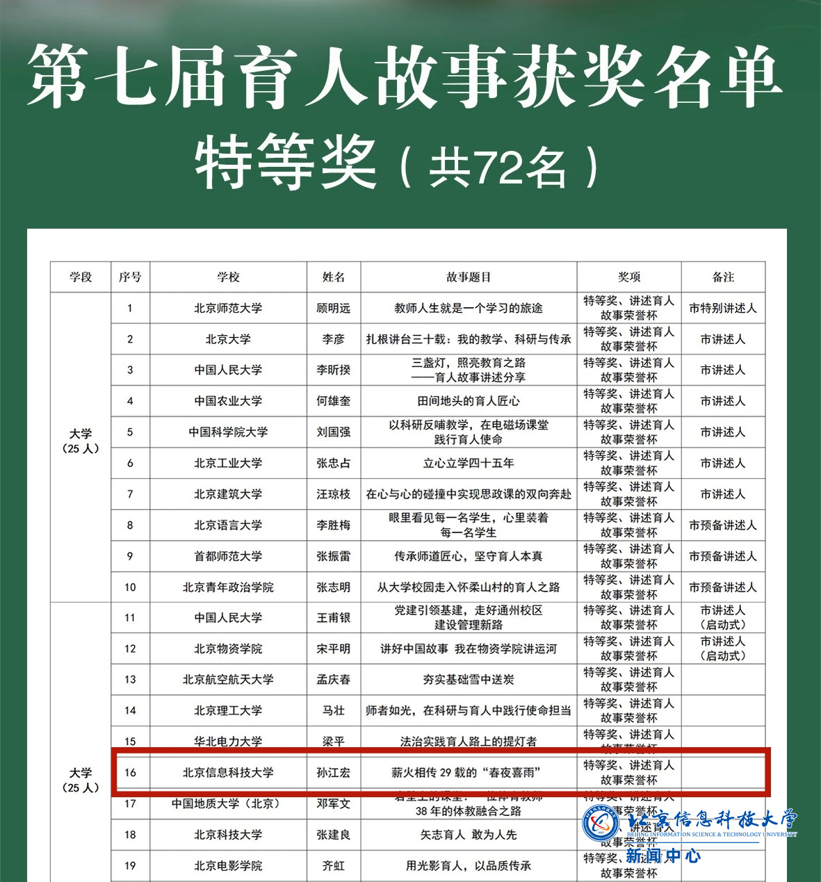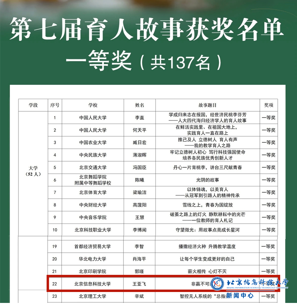 9月6日,在第41个教师节到来之际,由北京市委教育工委、北京市教委主办,北京市学校德育研究会承办的“为党育人、为国育才——第七届北京市大中小幼教师讲述育人故事展示交流活动”举办。开元集团网站机电工程学院孙江宏老师荣获特等奖被授予荣誉杯,信息与通信工程学院王亚飞老师荣获一等奖。
