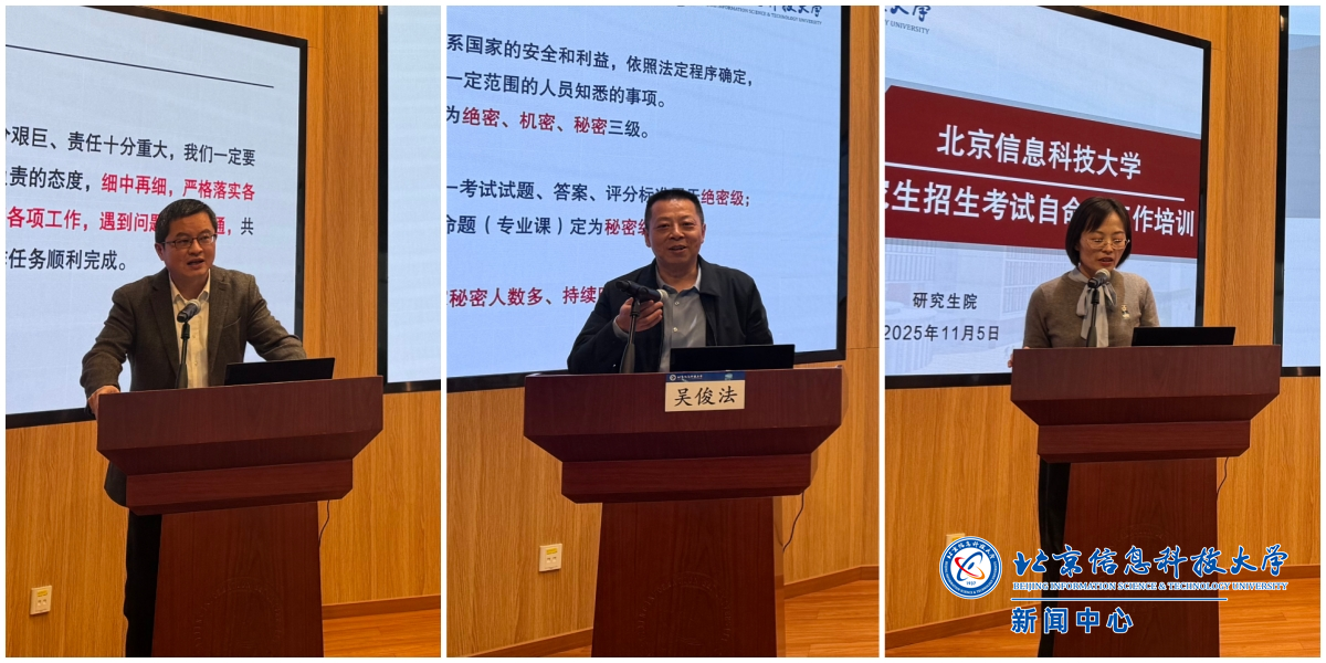会上,研究生院常务副院长李卓、保密办主任吴俊法、研究生院副院长尹洁林分别就2025年研究生招生工作总结与2026年研招组考安排、保密专题教育、2026年自命题工作作了汇报与培训。