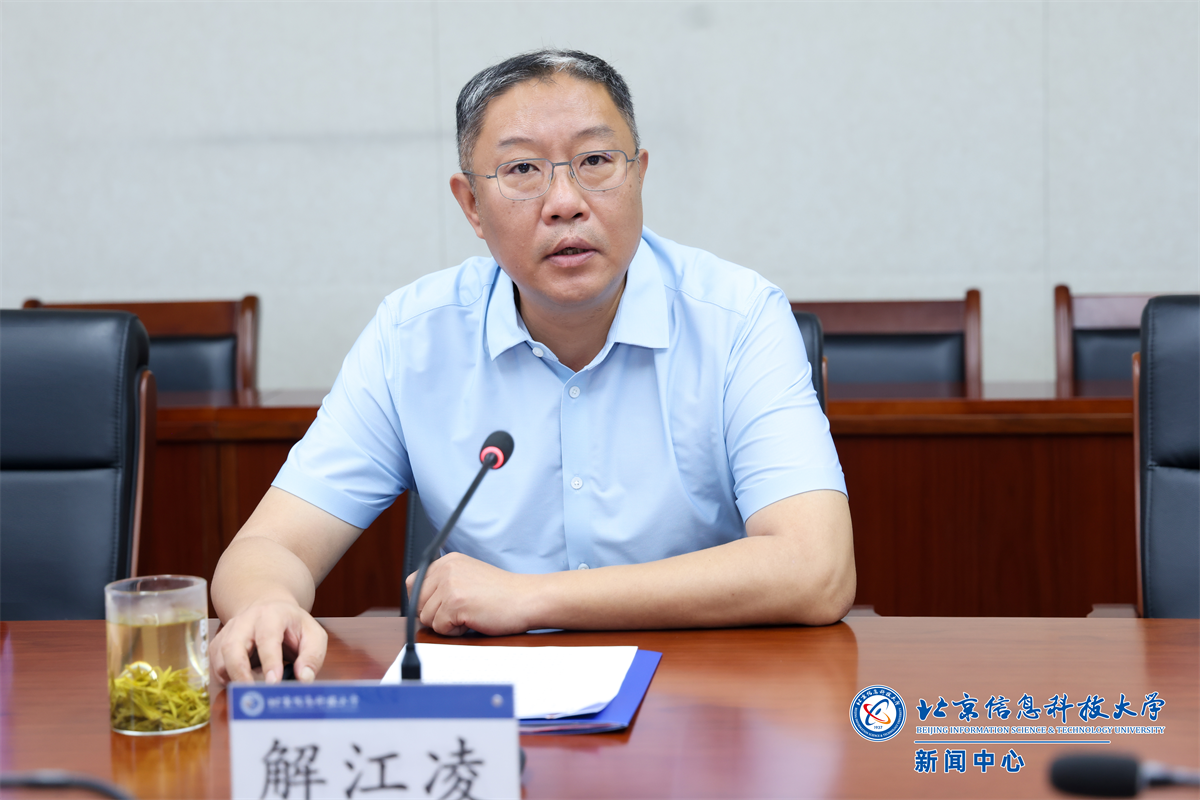 解江凌代表学校对孟波一行到访交流表示热烈欢迎,并由衷感谢北京市知识产权局长期以来对学校建设发展给予的大力支持。他在介绍中简要阐述了学校的办学特色、学科布局、科研优势以及在知识产权工作方面的整体规划等情况,着重介绍了学校在新一代信息技术、人工智能等前沿领域的深厚科研积累与取得的显著成果。解江凌表示,此次调研交流为双方深化合作、共谋发展提供了重要契机,他希望双方能够以此为契机,携手并进,充分发挥各自优势,共同为推动北京市知识产权事业迈向更高水平贡献力量。