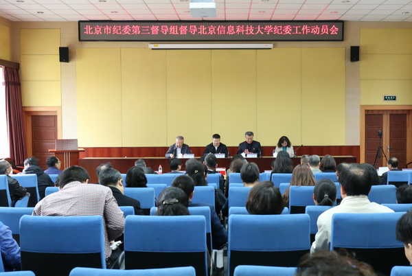 4月18日上午,北京市纪委第三督导组在学校小营校区国际学术交流教室召开督导北京信息科技大学纪委工作动员会。北京市纪委第三督导组组长贾利亚,校党委书记王传亮,校党委副书记、校长王永生,校纪委书记陈清华出席动员会。北京市纪委第三督导组全体成员、市纪委督导办工作人员、学校领导班子成员、校纪委委员、院级党组织书记、院级党组织纪检委员以及校纪委办公室全体工作人员参会。会议由王永生主持。
