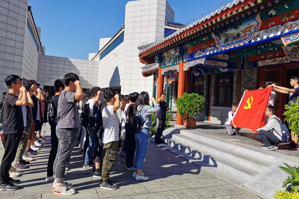 从展厅出来,大家来到了纪念馆一侧的开阔地带进行党员宣誓仪式。在鲜红的党旗下,邵飞作为领誓人带领全体党员高举右拳进行宣誓。在场的每一位师生党员都铿锵有力、慷慨激昂地重温了入党誓词。铮铮誓言,师生们更加坚定自己的共产主义信仰,党徽在党旗的映衬下栩栩如生。随后大家有序来到卢沟桥进行参观,形态各异的石狮子经过岁月的洗涤格外耀眼,大家走在斑驳的石阶上仿佛感受到那个炮火纷飞的年代,中国人民浴血奋战、宁死不屈的壮烈情怀,更加深刻缅怀革命英烈。
