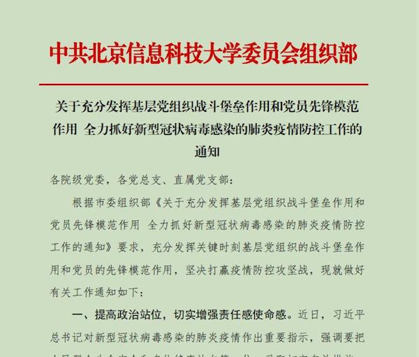 连日来,新型冠状病毒感染的肺炎疫情牵动着举国上下万千群众的心。为深入学习贯彻习近平总书记对新型冠状病毒感染的肺炎疫情的重要指示精神,落实党中央和北京市相关工作部署,推进疫情防控工作有序开展,学校党委组织部积极主动履职,对基层党组织、处级干部和全体党员迎击疫情防控工作,做出具体安排、提出明确要求,团结带领全校师生员工坚定信心,坚决打赢疫情防控阻击战。