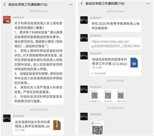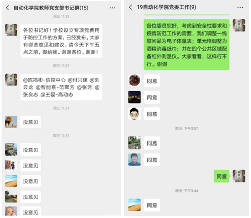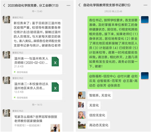 1月23日,学院党委书记、工会主席曹晋红第一时间通过微信群,向全体教职工传达了防控武汉地区发生的新型冠状病毒感染肺炎疫情的会议精神。1月24日,学院成立了专门工作组,更好地应对疫情,部署防控措施。1月25日晚,曹晋红连夜建立“2020自动化学院党委、分工会群”,确保所有的通知精神以及统一部署能够落实到每一位教职工。