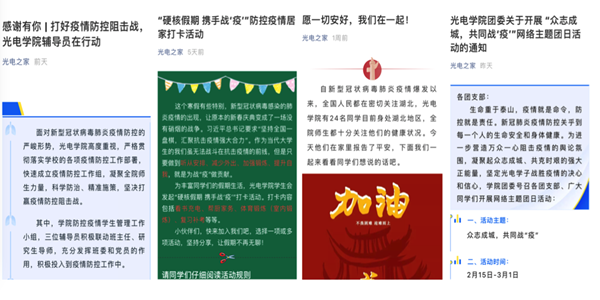 防控疫情,人人有责。学院利用公众号大力宣传、弘扬正能量,开展“防控疫情,感谢有你”主题系列报道;全院党员“防控疫情,从我做起!我是党员,我承诺”活动;“众志成城,共同战疫”网络主题团日活动;“硬核假期,携手战疫”防控疫情居家打卡活动;“愿一切安好,我们在一起”湖北同学报平安活动等。学院全体师生积极配合严格落实日报告、零报告制度。教师在职党员回社区报道,做好网上教学准备的同时,为所在社区防控疫情尽己所能。很多同学即使在家中,也为防控疫情贡献力量:有的同学给楼道电梯消毒,有的同学在社区站岗服务,有的同学则用视频或文字记录所感传播正能量……光电人用自己的方式践行着对国家和社会的使命担当。