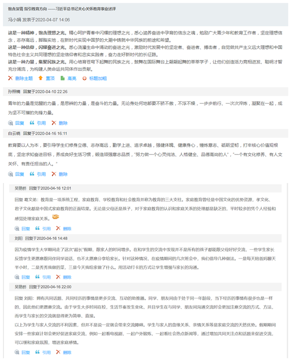通信学院辅导员史文硕:疫情的突然来袭,让假期中的学生和我们面对了很多新的情况,新的挑战。学生的思想政治教育怎么开展?疫情环境下学生的心理问题怎么疏导?怎么引导学生在居家环境下有效学习?国内外形势迅速变化,各种信息纷至沓来,怎样引导学生筛选获取信息,坚定理想信念?正是这次培训解答了很多我们当下迫切需要解决的问题,提供了疫情背景下思想引导、情感疏导、学习辅导、行为教导、就业指导等各个方面的知识和方法。网络培训的形式,更是让我们每天在忙碌的信息收集、数据整理等疫情防控工作之余,能够利用碎片化的时间,实现知识的“零存整取”。希望能够借助此次培训的宝贵机会,提高自身作为辅导员的工作能力,更好地把疫情的“危险”转化为“机遇”,开展好爱国主义教育、制度自信教育、理想信念教育,更好地落实立德树人的根本任务。