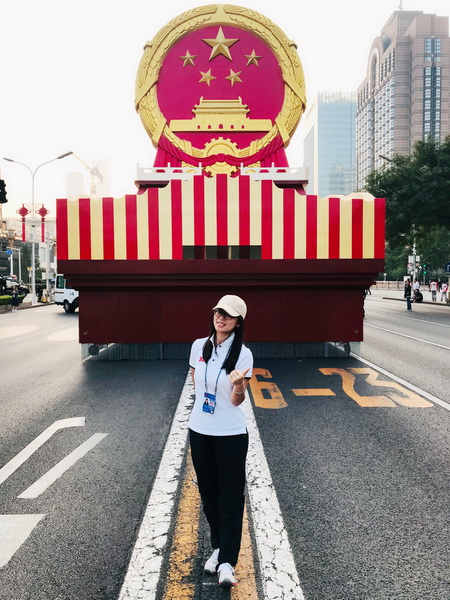 2019年,她带领学院318名学生参与到了庆祝新中国成立70周年群众游行活动的训练任务中来。在她看来,动员、报名、训练、游行,简单的8个字却包含了太多的酸甜苦辣。回忆起高温下70余天的繁重训练任务,学生时起时落的思想情绪,不计其数的训练物资发放,十几个深夜的迅速集结,这些应该是对这项神圣任务的最表面的概括,10月1日的激动与自豪才是内心深处的表达。期间,工作的临时调整,她被调配担任“浴血奋战”方阵彩车副车长,负责组织彩车与游行队伍间的配合训练,协调车上驾驶员、消防员、警察、应急推车人员之间的配合训练。模拟彩车时,她和学生们一起手举竹竿、条幅做成框架,与行进队伍训练;彩车下线时,她在浓烈的油漆味、闷热的封闭空间里,磨合所有元素的默契度。人车前后距离3m、人行步伐75cm、彩车行进速度4.5km/h,这些数字她都牢牢记在心上,不知道经历了多少次这样精准的训练,才换来了国庆当天来自全国人民的认可。国庆后,她又作为首都教育系统服务保障国庆活动宣讲团成员赴安徽医科大学、安徽工业大学作了题为“谢谢你给我的光荣”主题国庆精神宣讲,并在校内宣讲4场。在准备宣讲期间,她不停的修改稿件、不断的找老师辅导,发音、形态、表情,在她的努力下,宣讲活动获得了大家的一致肯定,她也将“一人受阅,全家光荣,一次受阅,一生的光荣”的精神传递出去。