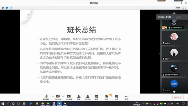 各班班委轮流发言,为老师们的辛勤付出致以诚挚的感谢。同时,总结了一年来的收获与不足,号召同学们加强假期自律,律行、律言,充分认识“居家也是战斗”,于己担责、于国担当,严格服从当地党组织和政府的部署,力所能及地参与疫情防控知识宣传普及工作。