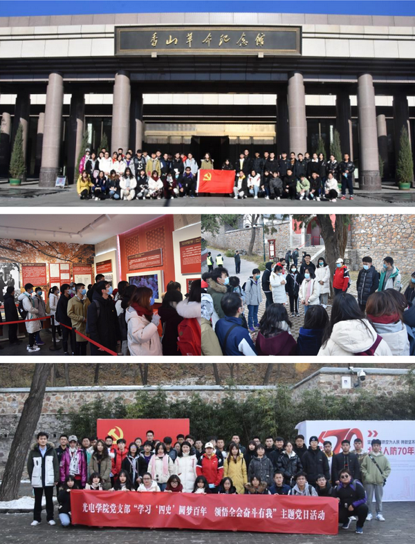 11月下旬,光电学院党委组织学生党支部党员和积极分子赴香山等学习教育基地,开展一系列以“学习‘四史’圆梦百年 领悟全会奋斗有我”为主题的党日活动,提升党性修养,培养爱国主义和奋进担当精神。本次系列活动涵盖7个学生党支部,共130多人参加,参与学生认真学习研讨,及时总结感想,系列活动取得良好教育效果。