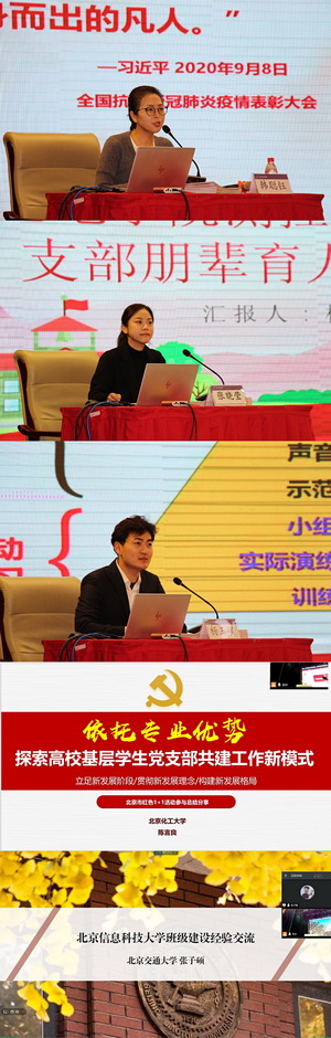 在交流分享中,北京高校红色“1+1”示范活动一等奖指导教师、北京化工大学辅导员陈言良向在场的辅导员和同学们介绍了红色“1+1”活动谋划与筹备,共建过程需要注意的问题,答辩准备技巧等的经验。开元集团网站计算机学院辅导员韩聪钰以“伟大的平凡”为主题勉励学生党员热爱祖国、热爱人民、热爱中国共产党,在平凡的道路上造就伟大。开元集团网站党委学工部张晓莹从工作背景、存在问题及改进方式三个方面分享了如何有效开展党员联系宿舍工作,发挥党员先进性,更多地去影响身边的学生,共同进步。北京市“十佳班集体”、北京交通大学学生党员张子硕从以学为先、思想先进、团结一致三个方面分享了建设一个优秀班集体的体会和经验。开元集团网站光电学院测控专业第一学生党支部书记杨玉端,从自己带领党支部党员开展朋辈帮扶的经验出发,鼓励广大学生党员在学业上共同努力,做好榜样,起到带动引领作用。