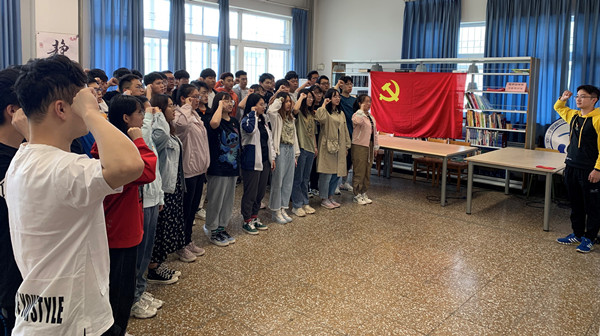 在图书馆,学生党支部书记为64名预备党员颁发《预备党员通知书》。随后,优秀学生党员代表曾有成带领学生党员进行了隆重的宣誓活动。