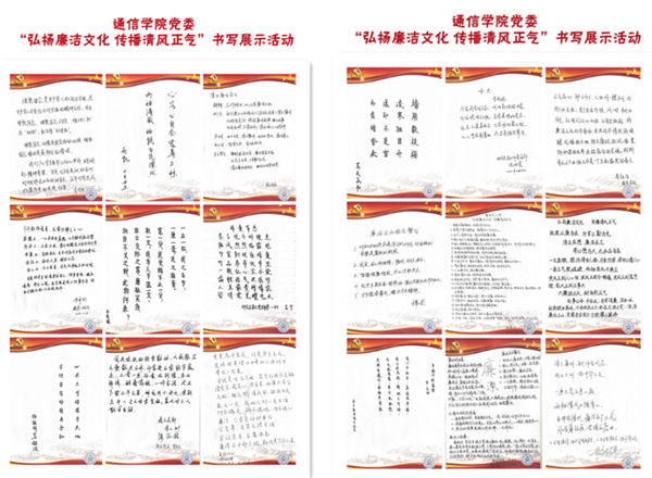 为进一步促进“全面从严治党宣传教育月”活动的深入开展,通信学院党委组织开展“弘扬廉洁文化 传播清风正气”书写作品展示活动。各支部针对党员群体特征,相继开展了以支部为单位的特色活动。活动提高了全体党员思想认识水平,加深了对新时代全面从严治党重要性、意义的理解与领悟,使党性修养得以锻炼与提升。