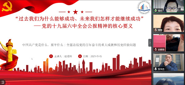 11月15日,图书馆直属党支部依托腾讯会议平台,组织全体党员专题学习党的十九届六中全会精神。图书馆馆长兼直属党支部书记赵爱玲作十九届六中全会公报核心要义导读。图书馆全体党员以及统战人士参与学习。