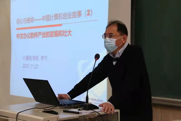 李宁以《初心与使命——中国计算机创业故事》为题,以金山WPS为例,讲述了中文办公软件产业的发展和壮大历程,向同学们展示了什么叫“为民族产业扛大旗”,指出了突破我国核心技术领域“卡脖子”现象的途径,激励同学们不忘初心,牢记使命,练就本领,砥砺前行。