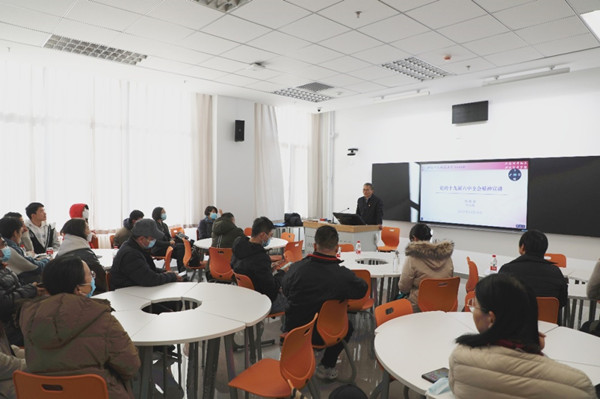 12月24日上午,校党委常委、统战部部长牛志英在新校区文理楼多功能教室宣讲党的十九届六中全会精神。学校部分统战人士及少数民族学生代表、统战部全体同志参加。
