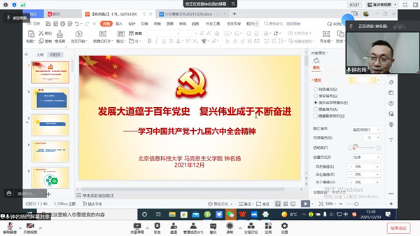 12月30日下午,马克思主义学院形势政策课教研室主任、外国语学院理论联系导师钟名扬以“发展大道蕴于百年党史,复兴伟业成于不断奋进”为主题,在线上为外国语学院宣讲中国共产党十九届六中全会精神,部分党员代表、积极分子和全体新生参加了此次宣讲会。