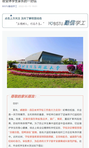 为进一步做好线上教学期间学生思想政治教育工作,持续提升思政工作的质量和水平,学校党委聚焦立德树人根本任务,贯彻“三全育人”工作理念,积极探索疫情期间“云思政”模式,制定并落实《关于做好线上教学期间本专科生思想政治教育工作的实施方案》,强化思想引领、突出价值引导、做好心理疏导,打好线上线下“组合拳”,确保疫情防控期间思政育人不断线。