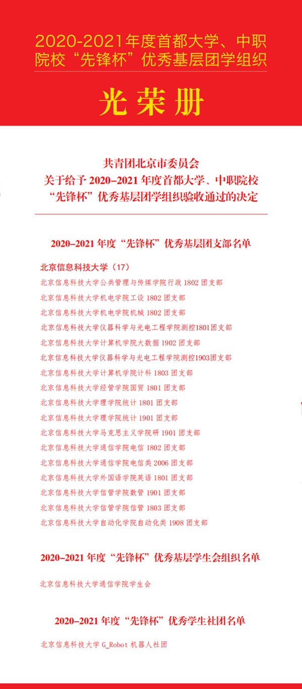 经过前期申报推选、中期阶段汇报、后期总结验收等环节,公共管理与传媒学院行政1802团支部等17个团支部被评为“优秀基层团支部”,通信学院学生会被评为“优秀基层学生会”,G_Robot机器人社团被评为“优秀学生社团”。