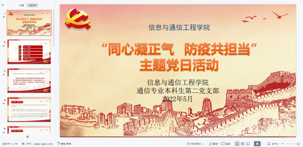 为进一步发挥基层党组织在疫情防控中的战斗堡垒作用,进一步发挥广大学生党员的先锋模范作用,全力做好疫情防控工作,在学校党委的部署下,信息与通信工程学院9个学生支部以 “同心凝正气,防疫共担当”为主题开展线上党日活动。学院学工负责人王继强,辅导员康延、史文硕、全海燕、李月琴全程参加党日活动。党建辅导员康延指导学生党支部策划落实活动开展。