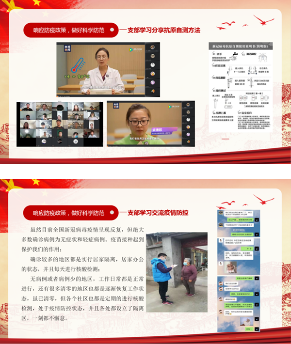 响应防疫政策,做好科学防范,增强防护意识。总结疫情期间支部开展疫情防控专题学习情况,巩固学习抗原自测的方法;同学们积极发言介绍家乡疫情形势及政策,汇报自己所感所想,互相提醒科学防护的重要性;展示身边同学参加家乡防疫志愿活动照片,肯定他们敢于担当、勇于奉献的精神品质,提醒他们一定做好科学防护,在志愿服务中用行动传播科学防护重要性。