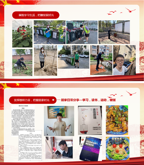 发挥榜样力量,展现学习生活,把握居家时光。发挥学生党员榜样引领作用,展现学生居家学习生活,每一张居家学习状态的照片,传递出居家上课要认真,要有“仪式感”;每一张学习笔记、学习计划图片,更是提醒同学们制定好学习目标,每日按计划执行,还可以给予自己每日完成“小奖励”;每一张居家劳动的照片,是生活的记录,更是提醒同学们合理规划居家学习生活,与父母融洽相处、积极沟通。