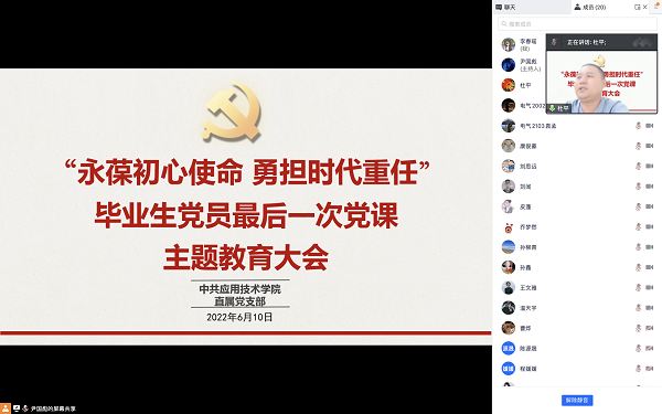 6月10日晚,应用技术学院直属党支部线上组织开展了以“永葆初心使命 勇担时代重任”为主题的毕业生党员“最后一次党课”教育活动。学院学生日常工作负责人杜平,组织员孙柳青、毕业年级辅导员尹国彪,学院首届全体毕业生党员参加了活动。