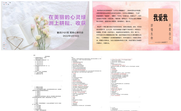 以“525心理健康节”活动为契机,帮助同学们在居家学习生活中保持乐观积极心态。翻译2101班举办“5?25”心理健康节活动,从如何处理生活中的人际关系和树立正确的爱情观两方面展开,倡议同学们在美丽的心灵绿洲上耕耘、收获。翻译2102班以心理健康问卷竞赛的形式,帮助同学们了解自我,认识自我,实现身心健康发展。