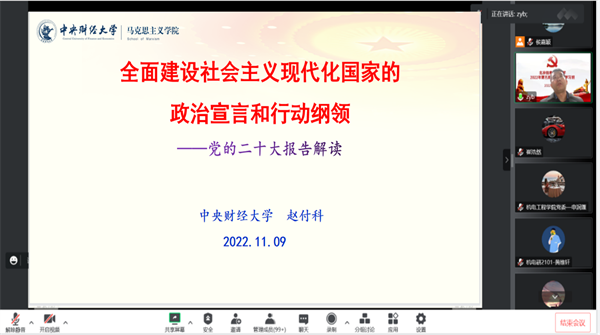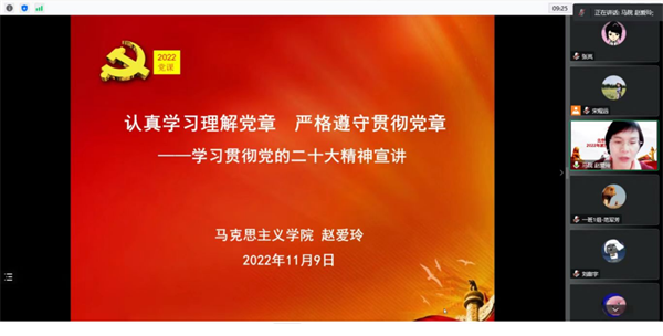 11月9日下午,学校党校2022年第五期校级党课学习班开班仪式以线上直播形式举办,2021年下半年发展的469名预备党员、2022年青年干部培训班学员参加讲座。马克思主义学院院长赵爱玲、中央财经大学赵付科教授受邀出席开班仪式并作报告。开班式由党委组织部副部长王瑾主持。