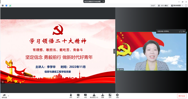 11月10日中午,信息与通信工程学院党委书记李学华教授以“学习领悟二十大精神——坚定信念 勇毅前行 做新时代好青年”为题,在线上为全院300余名师生党员、入党积极分子讲授专题党课。党课由学院党建辅导员康延主持。