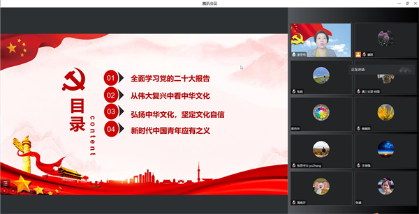 李学华结合自身学习体会,对党的二十大精神中应重点了解和掌握的内容作以解读,以“学什么”“怎么学”“如何干”三部分为着力点,强调各党支部要充分发挥主体作用,严格执行“三会一课”等制度,切实抓好学习贯彻工作。李学华表示,党的二十大报告字字千钧、句句铿锵、事事振奋,应当原原本本、逐字逐句深入学习,全面准确理解和把握党的二十大精神。随后,李学华由中华民族伟大复兴的历史目标引出中华文化统一、和平、发展的要义,带领同学们感受中华文明,倡导大家要坚定历史自信、文化自信,学会从中华优秀传统文化中汲取力量,同时将“勤以为学,信以立身”的校训与传统文化相结合,以考试诚信为落脚点,勉励同学们要从小事做起,坚持诚实守信,发扬传统美德。