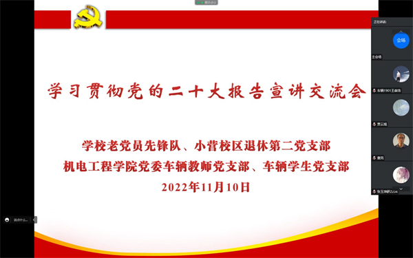 11月10日晚,机电工程学院党委与学校老党员先锋队、小营校区退休第二党支部联合举办学习贯彻党的二十大精神宣讲交流会。机电学院党委书记韩俊彦,小营校区退休第二党支部书记王芹芳,机电学院车辆专业教师党支部、学生党支部全体党员,小营校区退休第二党支部党员共同参加交流会。会议通过线上形式举行,由机电学院党委副书记包立辉主持。