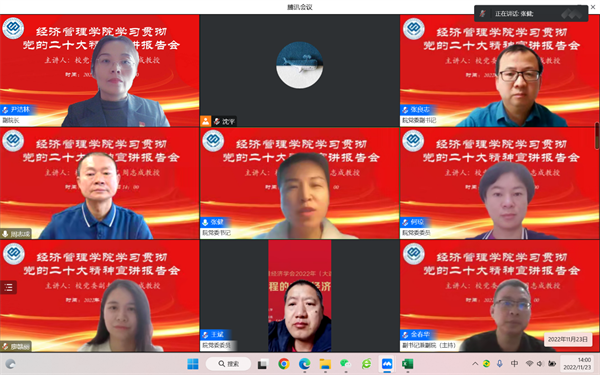 11月23日下午,学校党委副书记、“党的二十大精神宣讲团”成员、马克思主义学院教授周志成以线上方式为经管学院师生宣讲党的二十大精神。学院领导班子成员、党委委员、全体师生党员、预备党员、入党积极分子600余人参会。宣讲会由学院党委书记张健主持。