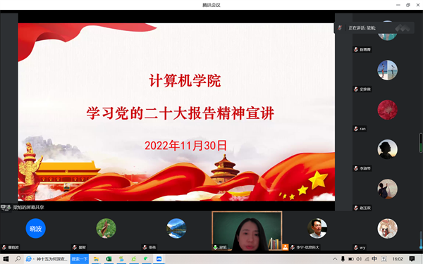 11月30日,计算机学院召开全体教职工大会,学院党委副书记(主持党委工作)兼副院长梁旭面向全体教职工宣讲党的二十大精神。