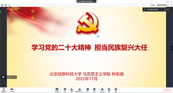 钟名扬从党的二十大的基本情况、二十大报告的整体解读以及新时代青年的责任担当三个方面进行讲述。他从十五个方面对党的二十大报告进行了深入浅出的讲解,从总论的辉煌成就、理论创新、使命任务到围绕“以中国式现代化全面推进中华民族伟大复兴”展开分论,再到向全党、全国人民和青年发出号召。他号召同学们要坚定不移听党话、跟党走,怀抱梦想又脚踏实地,敢想敢为又善作善成,立志做有理想、敢担当、能吃苦、肯奋斗的新时代好青年,让青春在全面建设社会主义现代化国家的火热实践中绽放绚丽之花。
