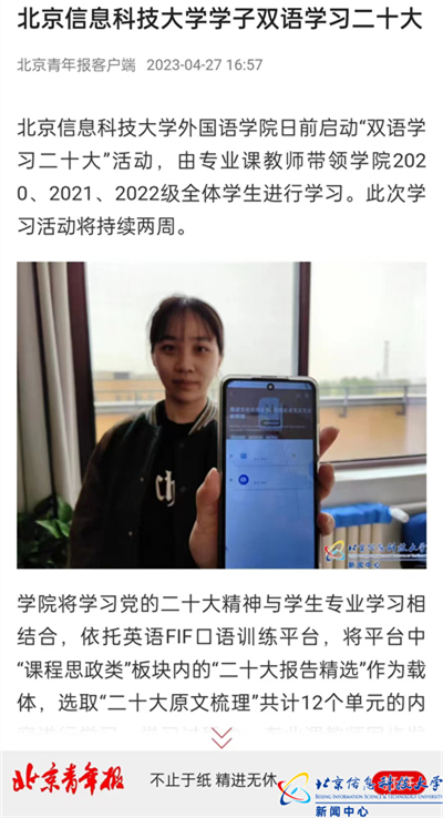 翻译系教师党支部指导学生支部开展“双语学习二十大”活动,将学习二十大精神与学生专业学习相结合,依托英语FIF口语训练平台“课程思政类”板块内的“二十大报告精选”进行挑战。活动被北京青年报报道。