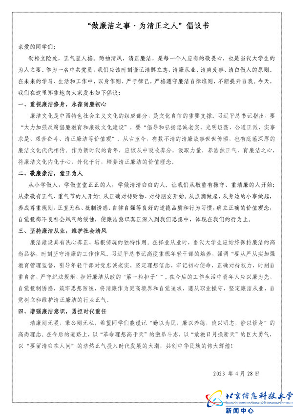 为教育引导毕业生树立廉洁观念、强化法治意识、扣好人生“第一粒扣子”,根据学校2023年全面从严治党宣传教育月活动的要求,4月28日至5月17日,外国语学院开展了“做廉洁之事·为清正之人”毕业生廉洁教育系列活动。活动包括图书漂流瓶、观看警示教育片、签署廉洁倡议书三个部分。