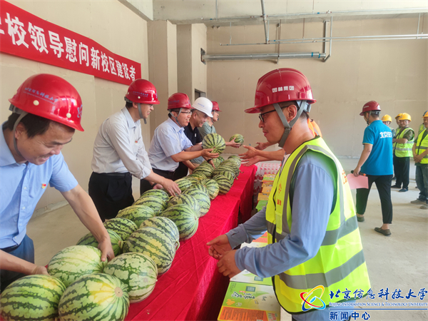 叶向忠代表学校感谢施工人员的辛苦付出,希望大家能继续发扬不惧酷暑战斗一线的精神,在保证施工安全的情况下,高效利用施工黄金期,保质保量的完成建设任务。叮嘱施工单位要认真落实高温户外施工相关规定,加强安全生产管理,注意防暑降温,办好员工食堂,保障一线施工人员生活安全健康,根据气温和工作实际,科学安排户外工作时间,以良好的精神状态投入工作,顺利完成项目建设任务。叶向忠还向新校区建设各项目单位施工人员赠送了防暑降温物品。