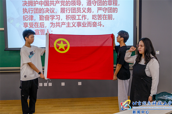 “北京市优秀共青团员”王艺霏带领新团员进行入团宣誓,全体团员面向团旗庄严宣誓。他们举起右拳,目光追随鲜艳的中国共产主义青年团团旗,以最赤诚的热情、最洪亮的声音表明态度和决心。