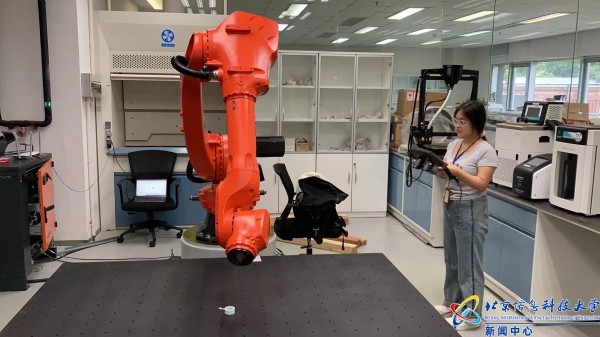 暑期,计算机学院教师在实验室调试工业机器人。