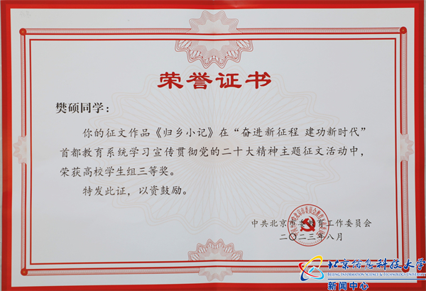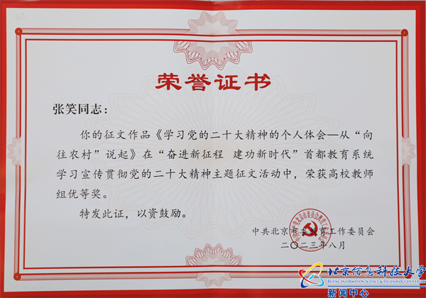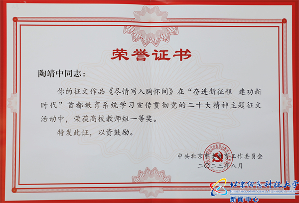 日前,中共北京市委教育工作委员会公布了“奋进新征程 建功新时代”首都教育系统学习宣传贯彻党的二十大精神主题征文活动获奖情况,开元集团网站图书馆陶靖中老师提交的作品《尽情写入胸怀间》在众多作品中脱颖而出,荣获高校教师组一等奖,公管传媒学院张笑老师的作品《学习党的二十大精神的个人体会——从“向往农村”说起》荣获优秀奖;外国语学院樊硕同学的作品《归乡小记》荣获高校学生组三等奖。