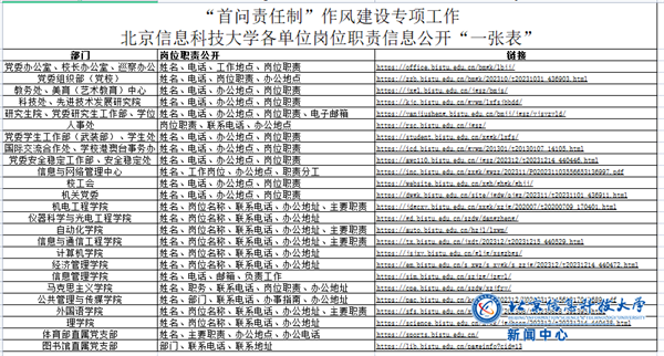 为强化责任担当,提升服务意识,督促各单位(部门)将首问责任制和岗位责任制紧密结合,积极推进岗位职责公开、办事流程优化等工作。经首问责任制专项工作组多轮研讨,深入调研,全面梳理岗位职责、办事指南、工作流程的公开情况,及时发现问题、提出对策,就“首问责任制”工作的宗旨目标及各单位目前存在的问题和改进方向,面向各单位(部门)进行阐释说明。在大家的共同努力下,截至2024年1月10日,各部门、学院在官方网站完成了岗位职责等信息的公开与更新,累计上线流程或指南70余项。经首问责任制专项工作组讨论研究,编制《北京信息科技大学各单位岗位职责信息公开“一张表”》。
