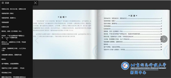 《北京信息科技大学机关首问责任制工作手册》分为PDF版本与电子书两种形式。PDF版本可以直接搜索查询获得具体信息,电子书则配备了目录检索功能,只需点击左下角目录,即可快速定位到目标部门。这一精心设计的目录结构有效提升了使用效率和便捷性。