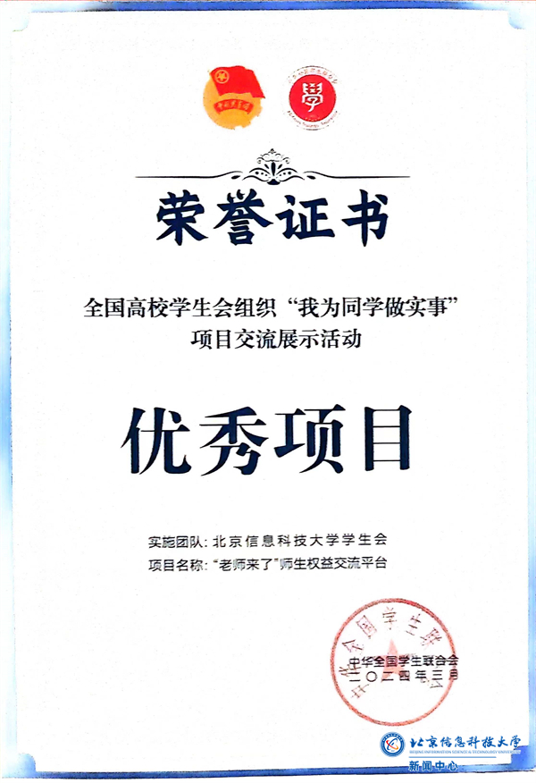 未来,北京信息科技大学学生会将继续推进“老师来了”师生权益交流平台品牌建设,践行学校“外树形象、内聚力量、服务师生、加快发展”的工作理念,坚持“从同学中来,到同学中去”,用心用情将身边小事落实落地,成为同学们心中想得起、找得到、靠得住的学生组织。(供稿:校团委 唐斌 孙楚凝 吕佳琪 图片:中华全国学联 孙楚凝 吕佳琪 编辑:李萌 审核:杨静)