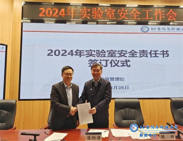 陈昕代表学校与部分学院签订了《北京信息科技大学实验室安全管理责任书》,进一步明确实验室安全责任。