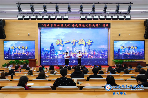 讲座后,学校师生代表上台为大家呈现了《献给红色中国的礼赞》《做一个战士》《师说》三组诵读作品,葛兰从诵读技巧、情感表达等方面进行了点评。