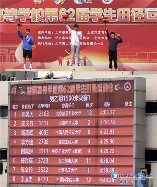 本届运动会是自1955年首届首都高校学生田径运动会举行以来,参赛高校和报名人数最多的一届。校田径队的队员们克服了天气炎热、个人伤病等不利因素,积极努力,奋勇拼搏,在高手如云的比赛中取得了2金2铜共计10项前八名的学校历史最佳成绩。其中来自光电学院光信2301班的郭昊天同学一人独揽两金,摘得男子乙组1500米和5000米的桂冠,成为学校历史上第一个参加首都田径运动会的赛会双冠王,也是本届运动会中为数不多的多金选手,为学校赢得荣誉,成为全场瞩目的焦点。