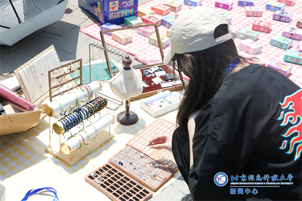 在跳蚤集市区,同学们用旧物设计作品、手工饰品,进行交换或出售,传递“以物换物”的绿色理念。