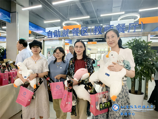 沙河校区第一食堂是主活动区,鲜艳的花篮、精美的伴手礼、美味的蛋糕烘托出了浓厚的节日气氛。教职工们在享用教师节午餐的同时,收到了教师节伴手礼。鲜花、贺卡、点心、优惠券、牛奶—一袋贴心的伴手礼,承载着信息科大满满的祝福、关心和尊重。高教研究室杨志耘老师说:“这个教师节过得特别开心。学校真的很贴心,让我们感觉心里暖暖的。”工会白莎莎老师感叹道:“又吃美食,又品蛋糕,还有精美伴手礼,真是太幸福啦!谢谢学校,谢谢后勤处、财务处。”图书馆周杰老师开心地拎着伴手礼福袋,边走边说:“今年的教师节,特别开心。”