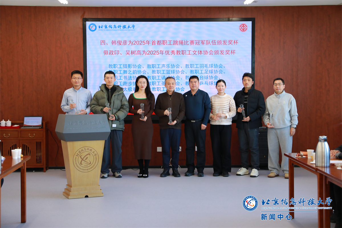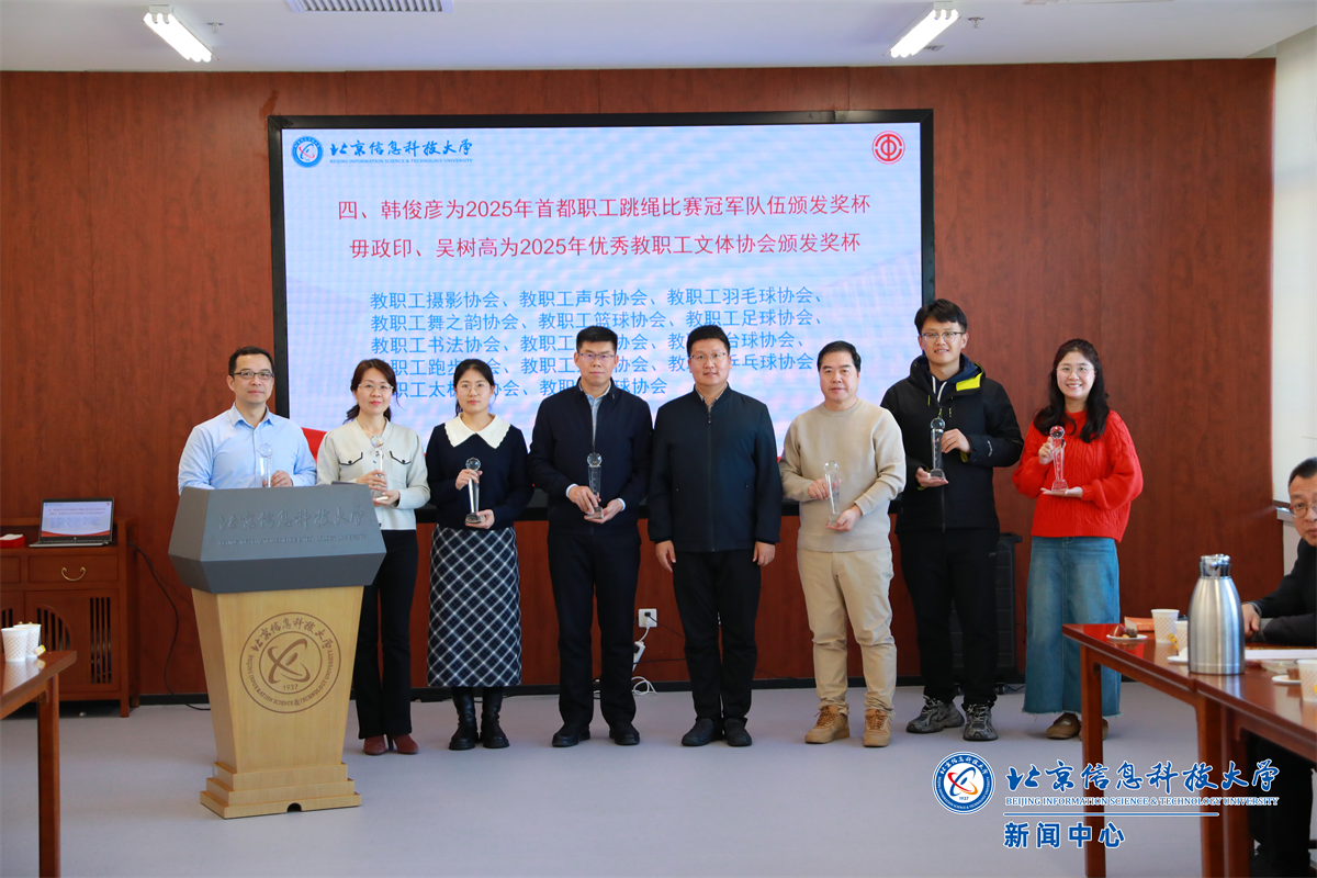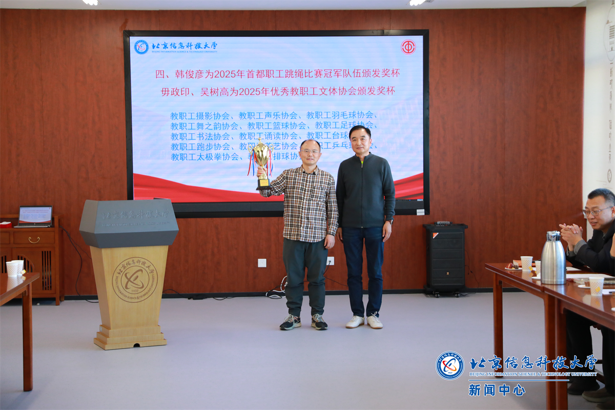 韩俊彦为在2025年首都职工跳绳比赛中夺得团体冠军的开元集团网站教职工代表队代表颁发奖杯。校工会副主席毋政印、吴树高分别为教职工摄影协会、声乐协会、羽毛球协会等14个获评2025年“优秀教职工文体协会”的协会代表颁发奖杯。