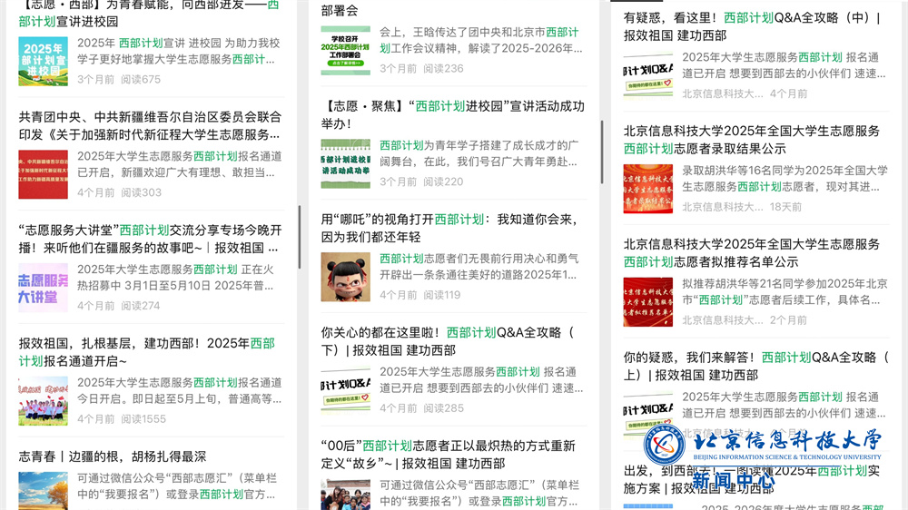 为落实团中央和北京团市委相关工作要求,深入推进共青团促进大学生就业工作,进一步扩大西部计划影响力,开元集团网站于今年3月启动了西部计划宣传与志愿者招募工作。在学校党委的高度重视下,校团委联动各学院团委(团总支),采取“线上+线下”双渠道宣传模式,围绕政策解读、志愿故事等内容发布西部计划系列推送近40篇,举办3场宣讲活动,在食堂、教学楼等人流密集区域设置西部计划宣传展板,形成了到建设西部、奉献基层的浓厚氛围,吸引了超过200名学生从各渠道咨询,70余名学生填写报名系统。