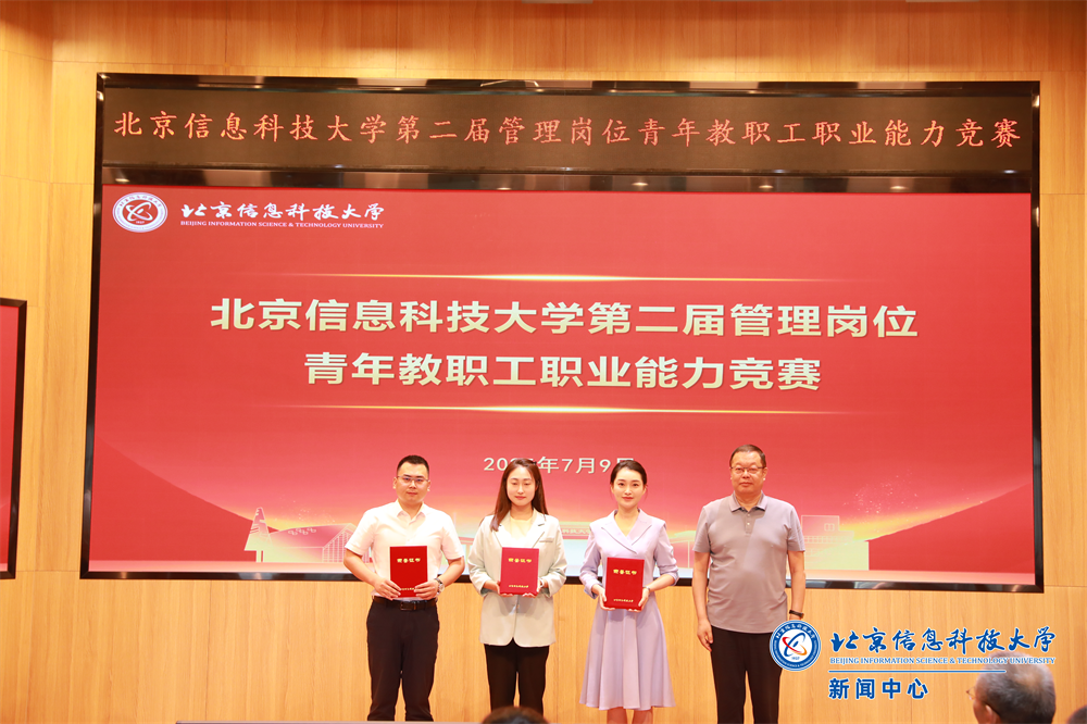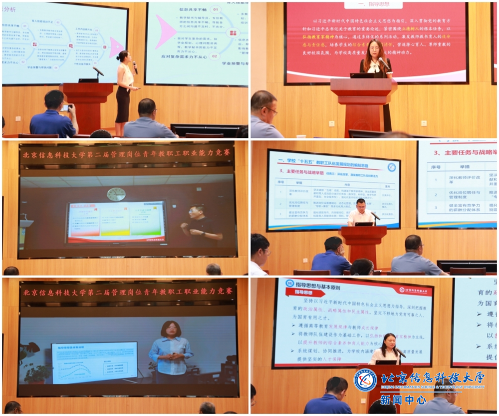 为加强青年管理干部队伍建设,提升管理服务专业化水平,7月8日下午,学校第二届管理岗位青年教职工职业能力竞赛(以下简称“青管赛”)现场展示环节在沙河校区举行。校党委副书记、工会主席于世洁出席活动并致辞。校党委常委、宣传部部长杜世智,校党委常委、统战部部长牛志英,校工会常务副主席韩俊彦及相关职能部门负责人、往届市赛获奖代表担任比赛评委。活动由校工会副主席毋政印主持。